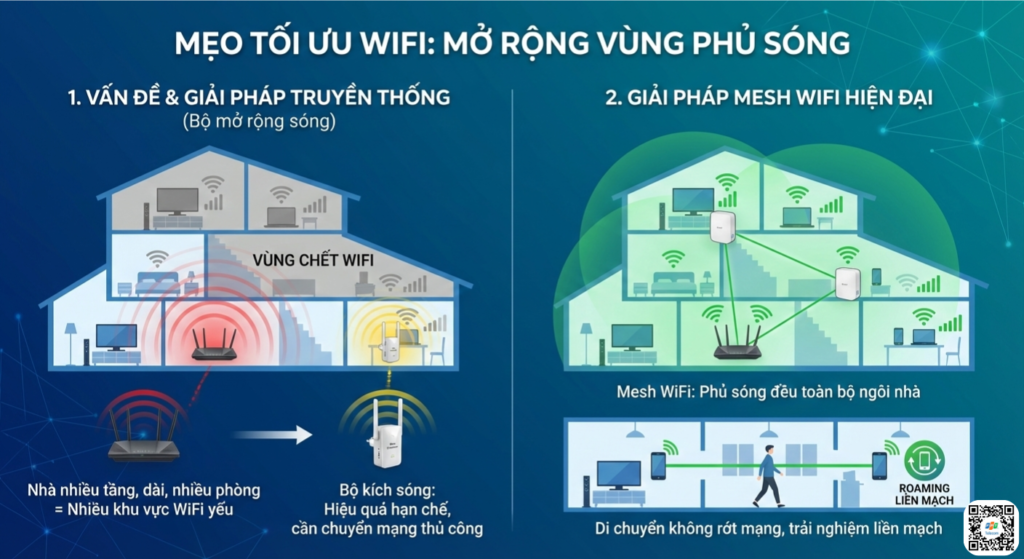 → Nên dùng Mesh WiFi hoặc bộ mở rộng sóng.